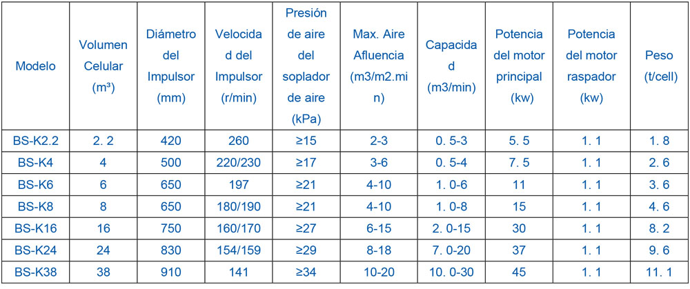 Parámetros técnicos-Serie BS-K de la máquina de flotación inflable:
