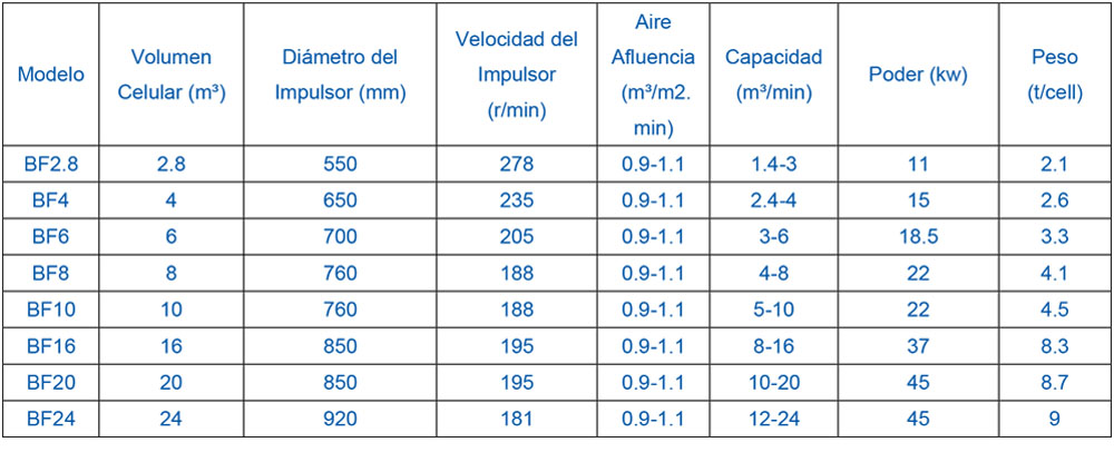 Parámetros técnicos-Serie BF de la máquina de flotación: